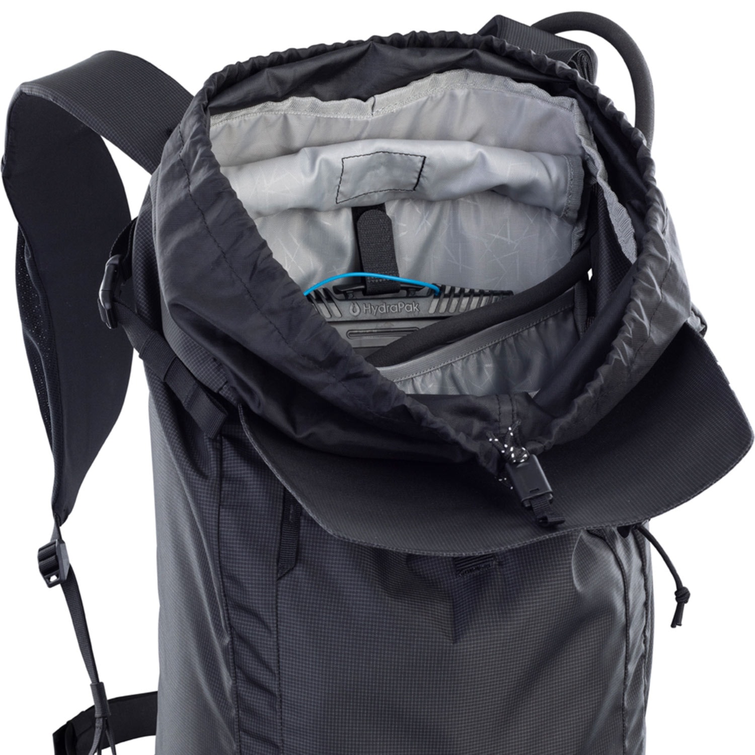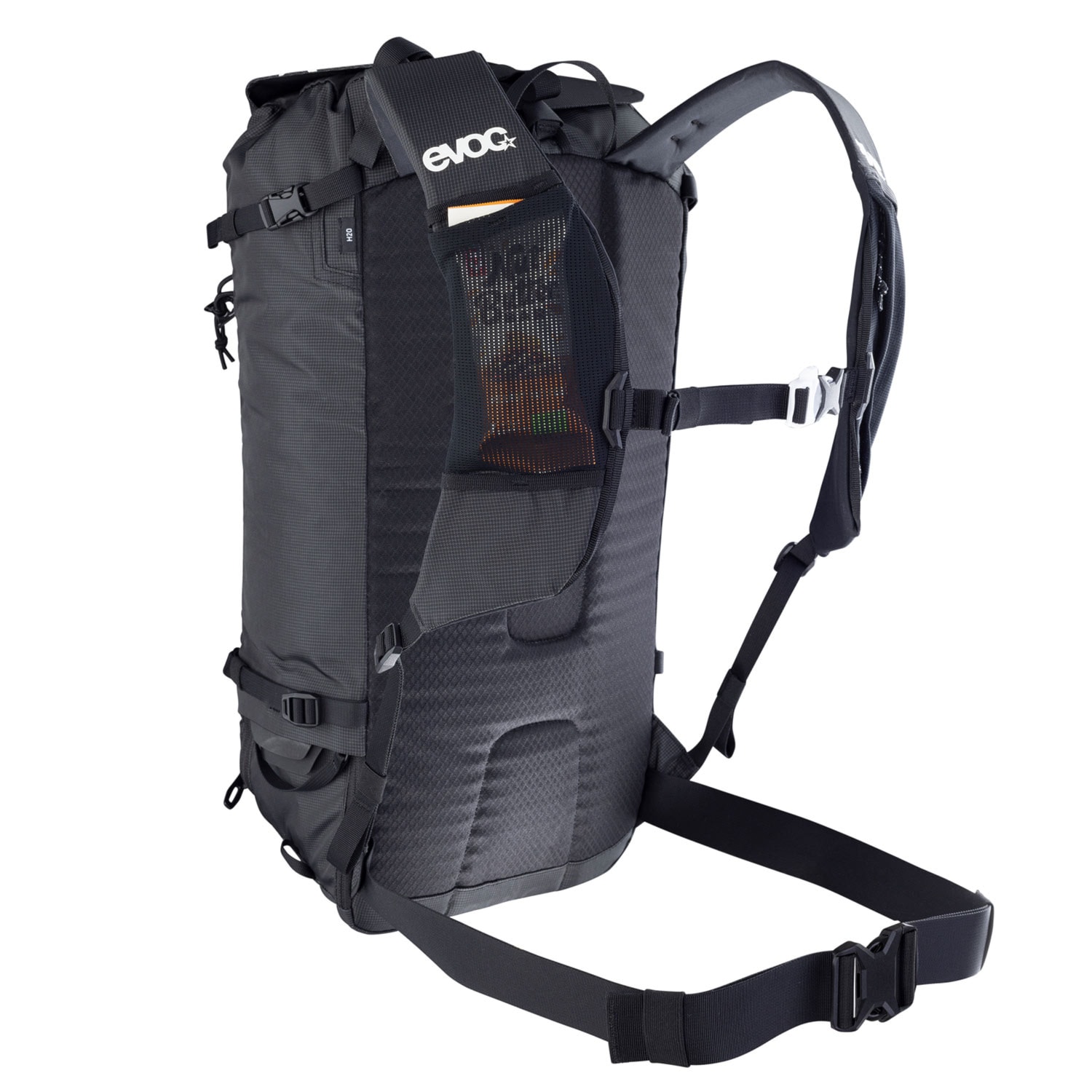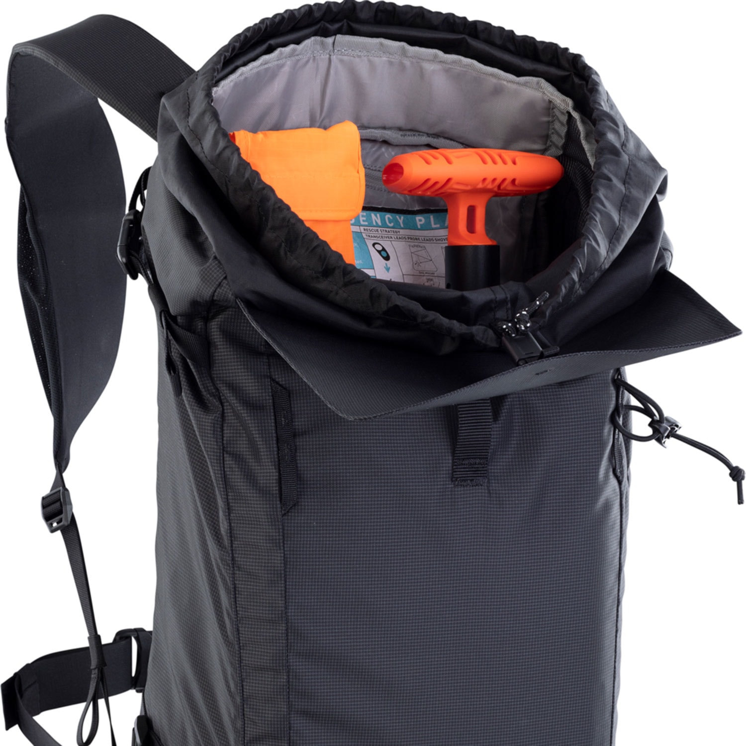 Lopata a sonda patria do vrecka na lavínové vybavenie s integrovaným núdzovým plánom. Priehradka na stúpacie pásy / mačky je ideálna na prehľadné uloženie pásov po výstupe, zatiaľ čo priehradka na hydrovak pojme objem až 3 l pre nepretržité zásobovanie vodou na túre.