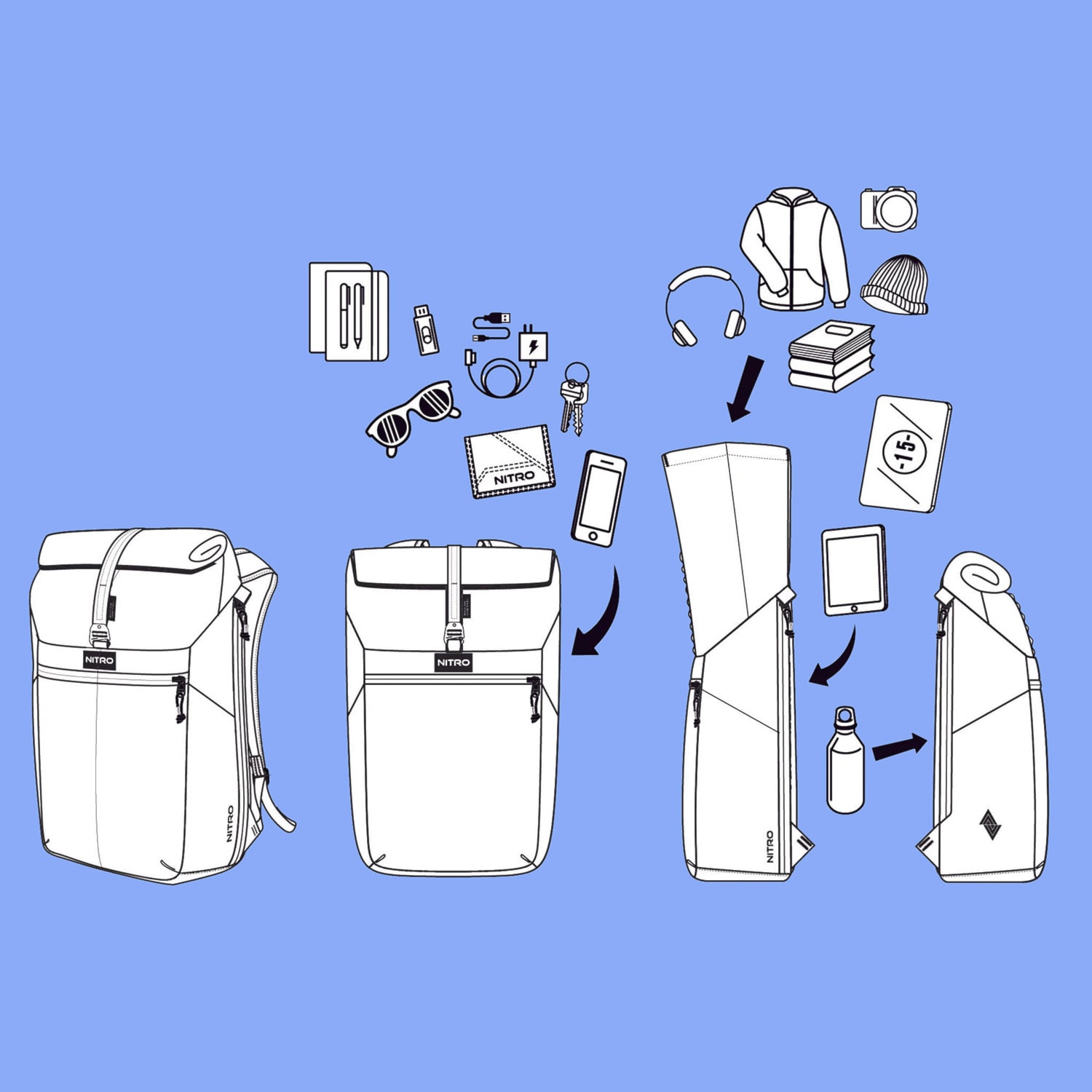 Superľahký, univerzálny batoh s rolovacím uzáverom je ideálnym spoločníkom pre každodenný pohyb v meste. Vďaka nastaviteľnému objemu od 24 do 26 litrov a veľkému hornému otvoru ponúka dostatok úložného priestoru. Ďalšími prednosťami sú polstrovaná priehradka na notebook, bočné vrecko na fľašu, veľké predné vrecko s klipom na kľúče a vodoodpudivým zipsom YKK, rovnako ako vnútorný organizér. Ergonomicky polstrovaný chrbtový panel a ramenné popruhy zaisťujú maximálne pohodlie.
